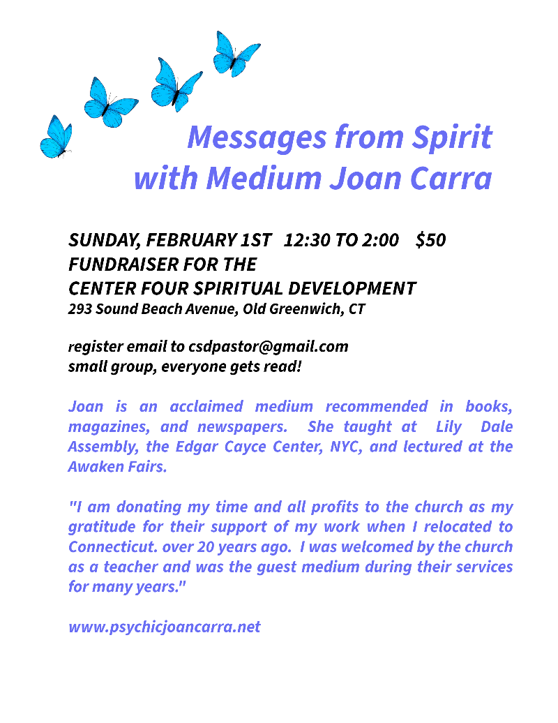The Center’s sacred atmosphere supports the work of spirit. We suggest making Reading /Healing reservations. (Contact: CSDPastor@gmail.com). Please note that you are not booked unless you receive a confirmation email from CSDPastor@gmail.com.